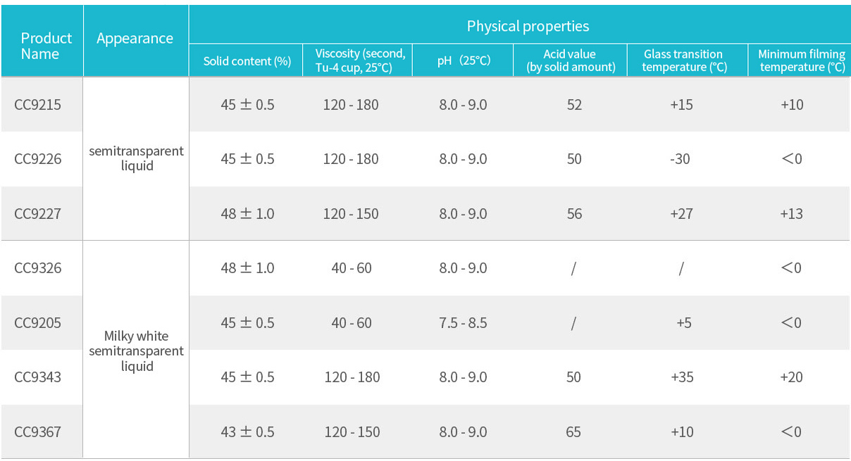 ● Filming emulsions are used in water-based flexographic printing and gravure inks and water-based varnishes. The product is applicable to the printing of paper, films and aluminum foils as it has excellent water resistance and wear resistance performance and the ability to improve the filming performance of the emulsions having high temperature requirements.