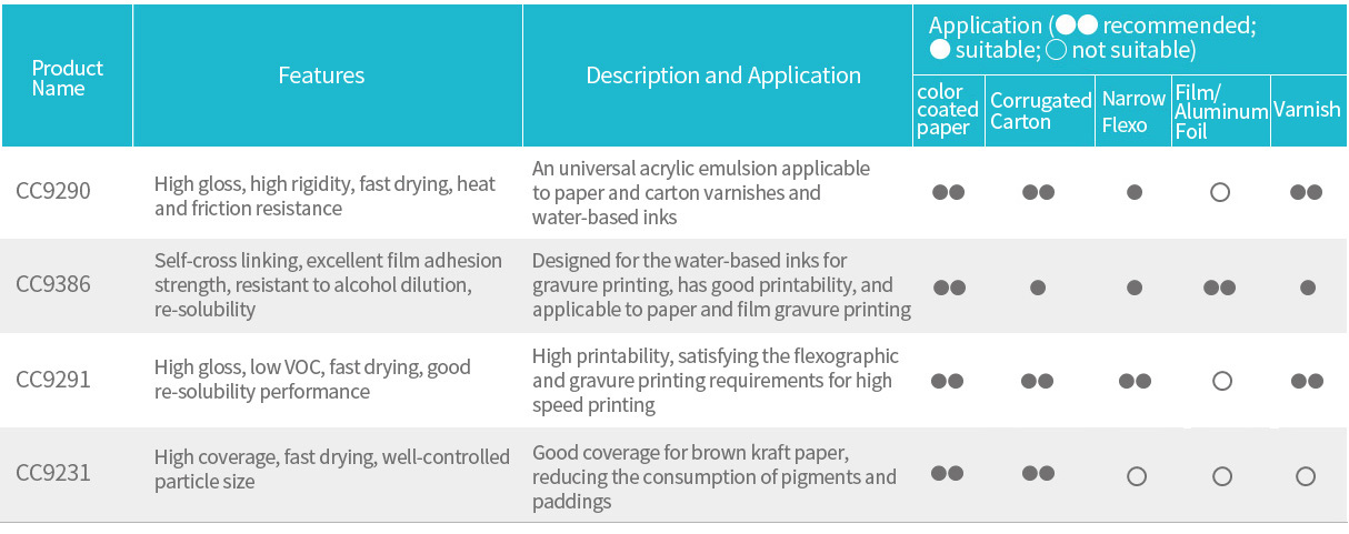 ● In flexographic and gravure printing, the non-filming emulsion shortens the drying time of varnishes and inks, and improves the glossiness, coverage and wettability.
